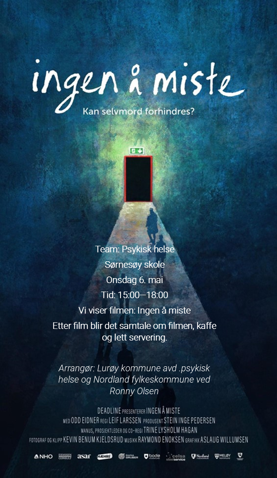 Ingen å misteLurøy kommune avd. psykisk helse og Nordland fylkeskommune v/Ronny Olsen, inviterer til film: "Ingen å miste" og samtale i etterkant. Det blir mulighet for kaffe og lett servering.Filmen vises på Sørnesøy, og er åpen for alle.Dato: Onsdag 6. maiTid: kl. 15:00 - 18:00Sted: Sørnesøy skole