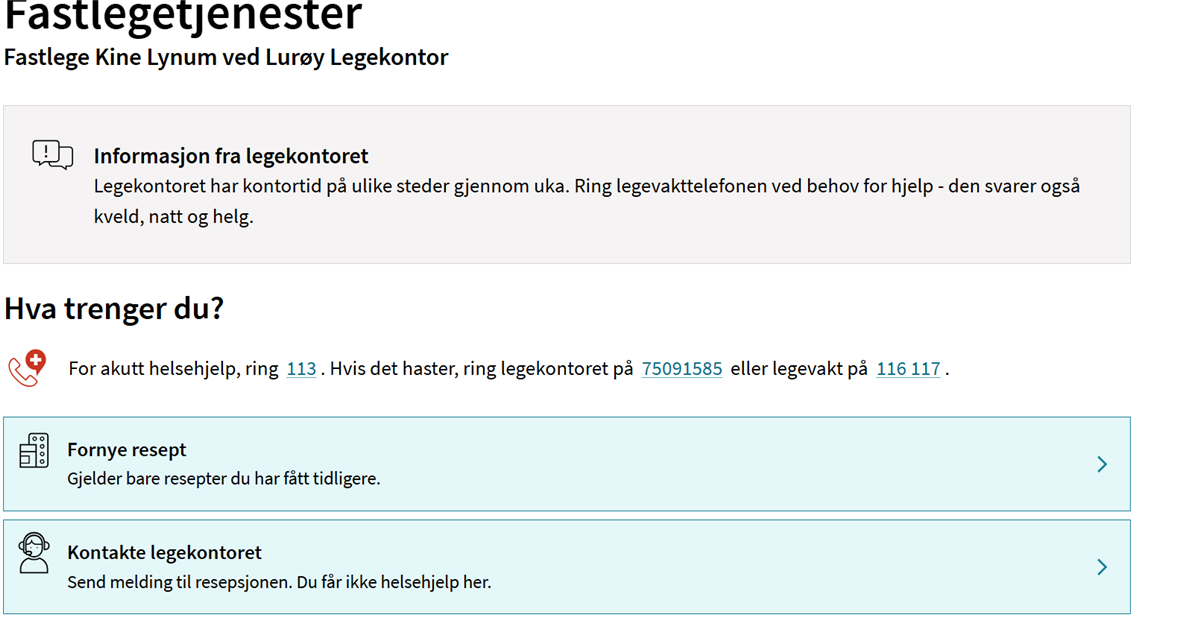 Lurøy legetjeneste har tatt i bruk HelsenorgeFor å komme i kontakt med oss kan du nå bruke www.helsenorge.no eller appen Helsenorge. Du logger inn med ditt fødsels- og personnummer.Velg fanen “Din fastlege”.Deretter kan du velge om du vil fornye resept eller kontakte ditt legekontor. For å bestille time må du foreløpig velge “Kontakt ditt legekontor”. Skriv en kort oversikt om hvorfor du tar kontakt, og beskriv kort hva du trenger time til. Last opp eventuelle vedlegg og trykk på “Send”. Du vil deretter få en kvittering på at henvendelsen er sendt. Legekontoret tar så kontakt med deg gjennom Helsenorge med informasjon om når du har fått time. Legetjenesten oppfordrer samtidig alle som står med feil fastlege om å bytte til den legen som har ledig på sitt legekontor.