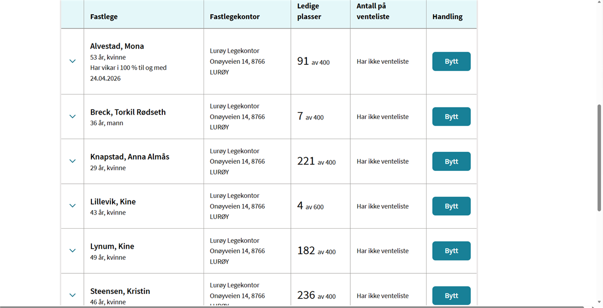 Påminnelse - viktig informasjon om fastlegeLurøy legetjeneste ser at det fortsatt er mange av innbyggerne i Lurøy som står oppført med feil fastlege. Man kan enkelt bytte fastlege ved å logge inn på nettsiden til Helsenorge; Helsenorge – din helse på nett - Helsenorge eller via appen.Utklipp fra Helse NorgeLogg inn: Logg inn med din elektroniske ID (f.eks. BankID).Finn tjenesten: Velg “ Vis flere tjenester”, og naviger videre til “Bytte fastlege”. Søk etter leger: Søk etter fastleger i den kommunen du ønsker.Utklipp fra Helse NorgeFiltrer og velg: Bruk filtre for å finne ledige plasser og leger som snakker språket du foretrekker.Bekreft byttet: Velg legen ved å trykke på “Bytt”. Du vil få en bekreftelse på når byttet trer i kraft. Utklipp fra Helse NorgeDersom du ikke mestrer å bytte fastlege selv, kan du ringe Veiledning Helsenorge på telefon 23 32 70 00.Vi oppfordrer samtidig pårørende til å hjelpe sine dersom de ikke mestrer å gjøre dette selv. Du kan velge blant seks leger som per 22.4.2026 alle har ledige plasser:Leger på Lovund/Sleneset: Anna Almås Knapstad; 221 ledige plasserKine Lynum, 182 ledige plasserKristin Steensen; 236 ledige plasser Leger på Onøy/Bratland:Mona Alvestad; 91 ledige plasserTorkil Rødseth Breck; 7 ledige plasserKine Lillevik; 4 ledige plasser
