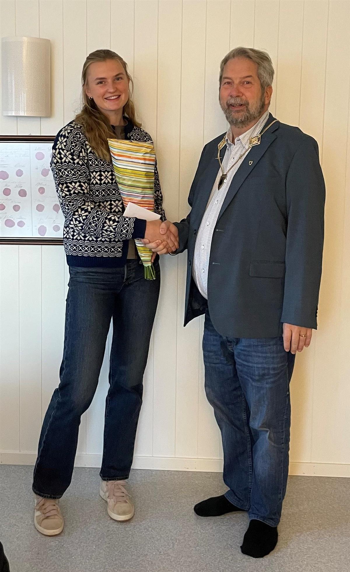 Under møtet fikk hun overrakt blomster og gavekort fra Lurøy kommune og vi fikk gratulert henne med tittelen som norgesmester.